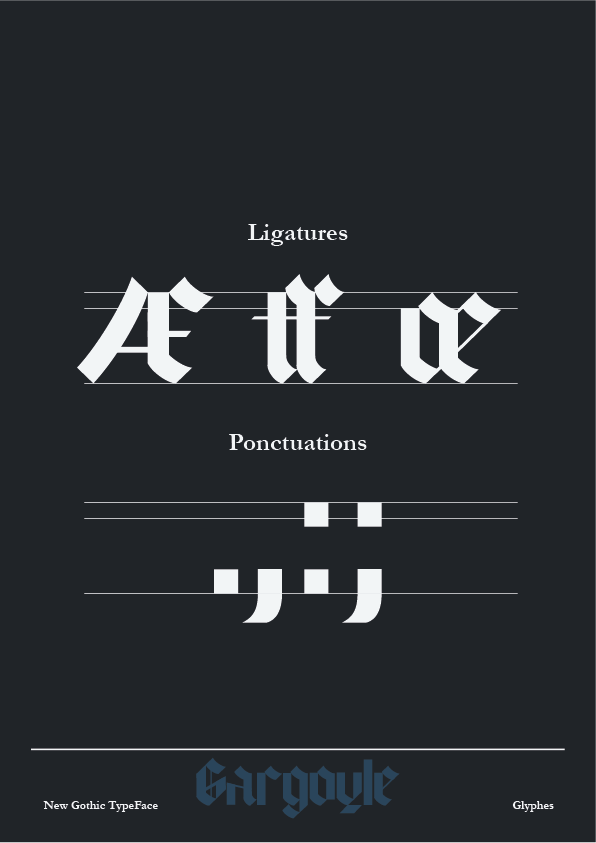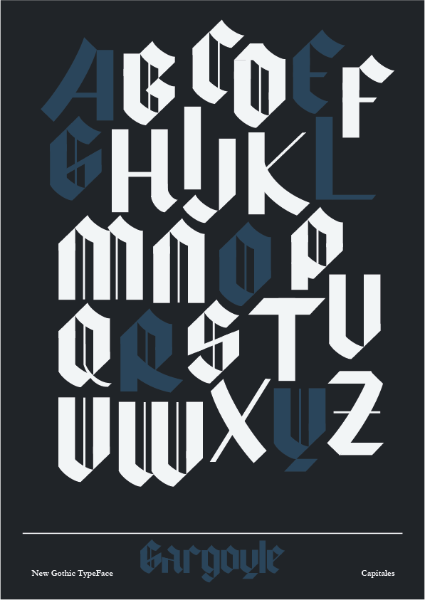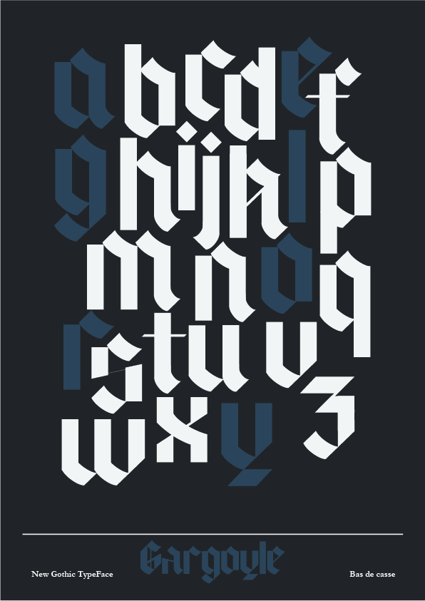 Après de nombreuses recherches à la plume et à l’encre de chine, les caractères gothiques choisis furent modernisés tout en gardant des traces de l’ancien, comme retrouvé ci-dessous.